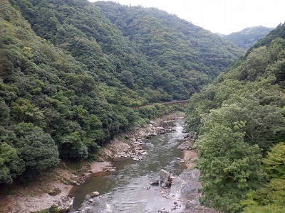 ゴールして、日本では、少し珍しい橋の上の駅、保津峡駅から絶景!!