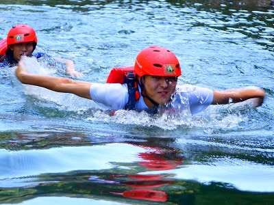 Young boys are enjoying the frist rapid of the hozu river.