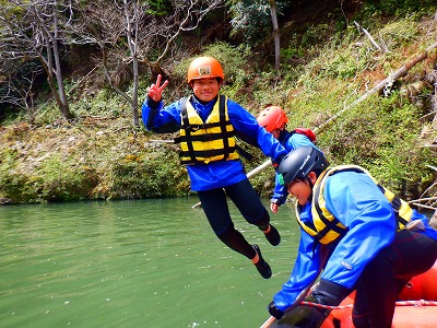 桜吹雪と共に京都保津川でラフティング体験です